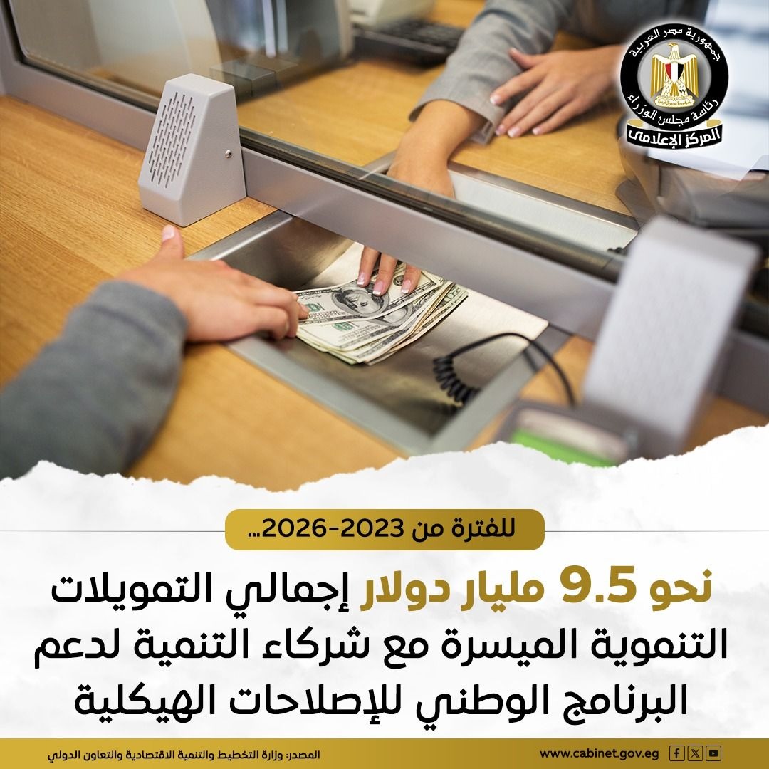 أعلنت وزارة التخطيط والتنمية الاقتصادية والتعاون الدولي أن مصر حصلت على تمويلات تنموية ميسرة بقيمة نحو 9.5 مليار دولار من شركاء التنمية الثنائيين ومتعددي الأطراف، وذلك للفترة من 2023 حتى 2026، لدعم الموازنة العامة للدولة وتنفيذ البرنامج الوطني للإصلاحات الهيكلية.