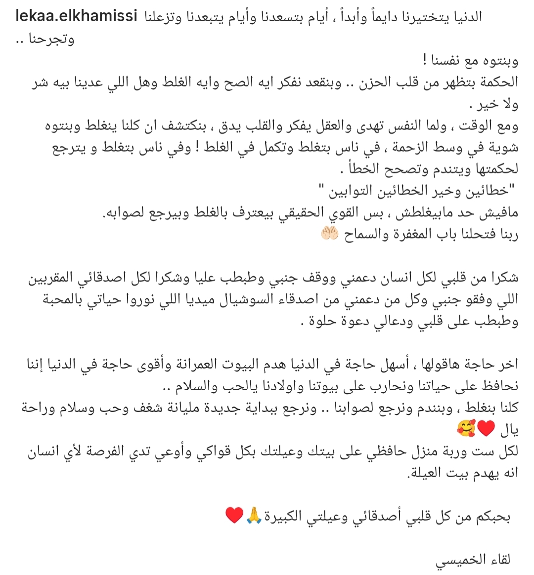 ووجهت رسالة للسيدات، قالت: لكل ست وربة منزل حافظي على بيتك وعيلتك بكل قواكي وأوعي تدي الفرصة لأي انسان انه يهدم بيت العيلة.. بحبكم من كل قلبي أصدقائي وعيلتي الكبيرة.. لقاء الخميسي.