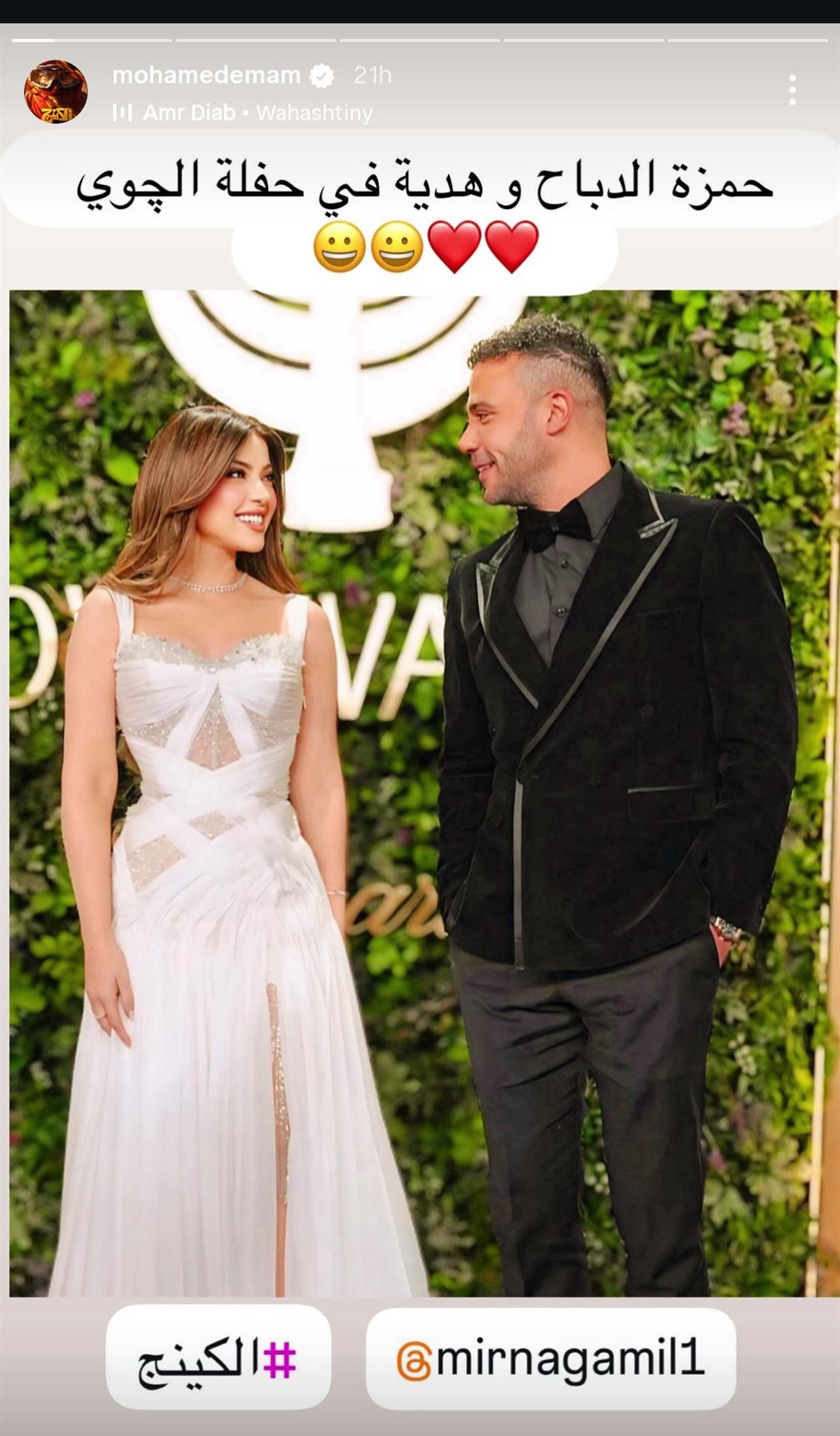ونشر محمد إمام صورة رومانسية تجمعه بـ ميرنا جميل خلال حفل جوي اووردز، على أغنية أجمل هدية، من خلال حسابه الرسمي عبر موقع تبادل الصور والفيديوهات القصيرة إنستجرام، عبر خاصية ستوري، وكتب: حمزة الدباح وهدية في حفلة الچوي.. الكينج.