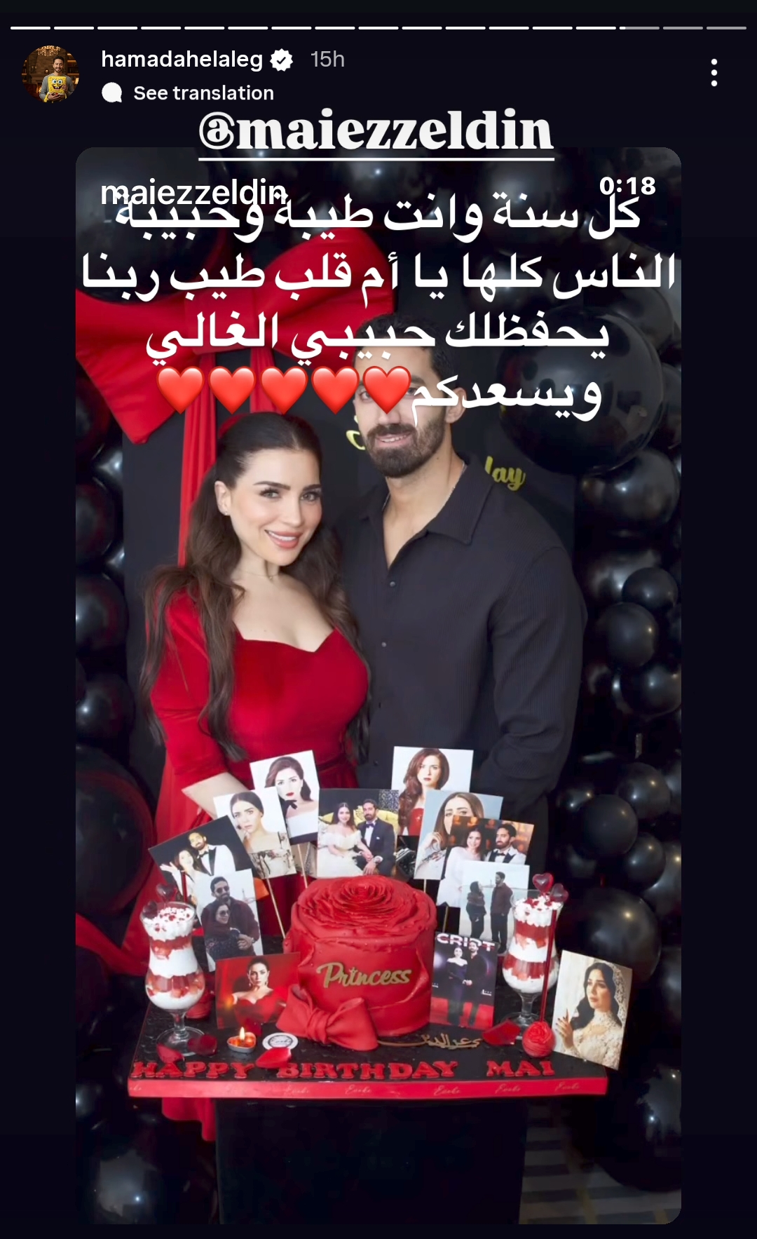 ونشر حمادة هلال صورة تجمع مي عز الدين وزوجها أحمد تيمور، من خلال حسابه الرسمي عبر موقع تبادل الصور والفيديوهات القصيرة إنستجرام، عبر خاصية ستوري، وكتب: كل سنة وانت طيبة وحبيبة الناس كلها يا أم قلب طيب.. ربنا يحفظك حبيبي الغالي ويسعدكم.