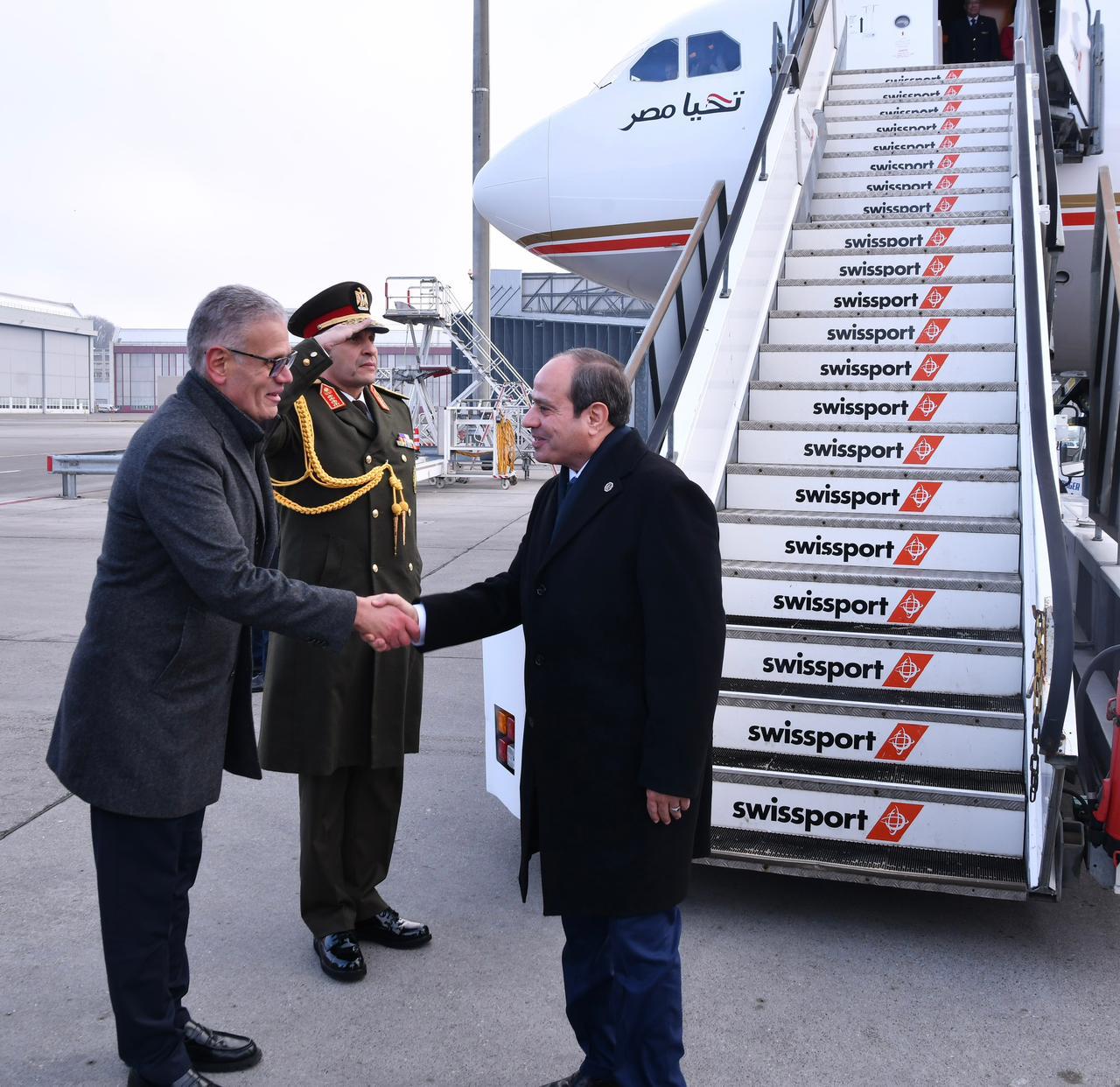 ورصدت الصور استقبال السفير محمد نجم، سفير جمهورية مصر العربية في برن، والسفير علاء حجازي، المندوب الدائم لجمهورية مصر العربية لدى الأمم المتحدة في جنيف، والمستشار أمجد رزق، قنصل جمهورية مصر العربية بالاتحاد السويسري، للرئيس عبد الفتاح السيسي رئيس جمهورية مصر العربية.