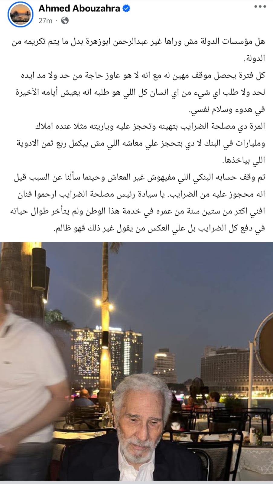 وكتب أحمد أبو زهرة من خلال حسابه الرسمي عبر موقع التواصل الاجتماعي فيسبوك، قال: هل مؤسسات الدولة مش وراها غير عبدالرحمن أبوزهرة بدل ما يتم تكريمه من الدولة.