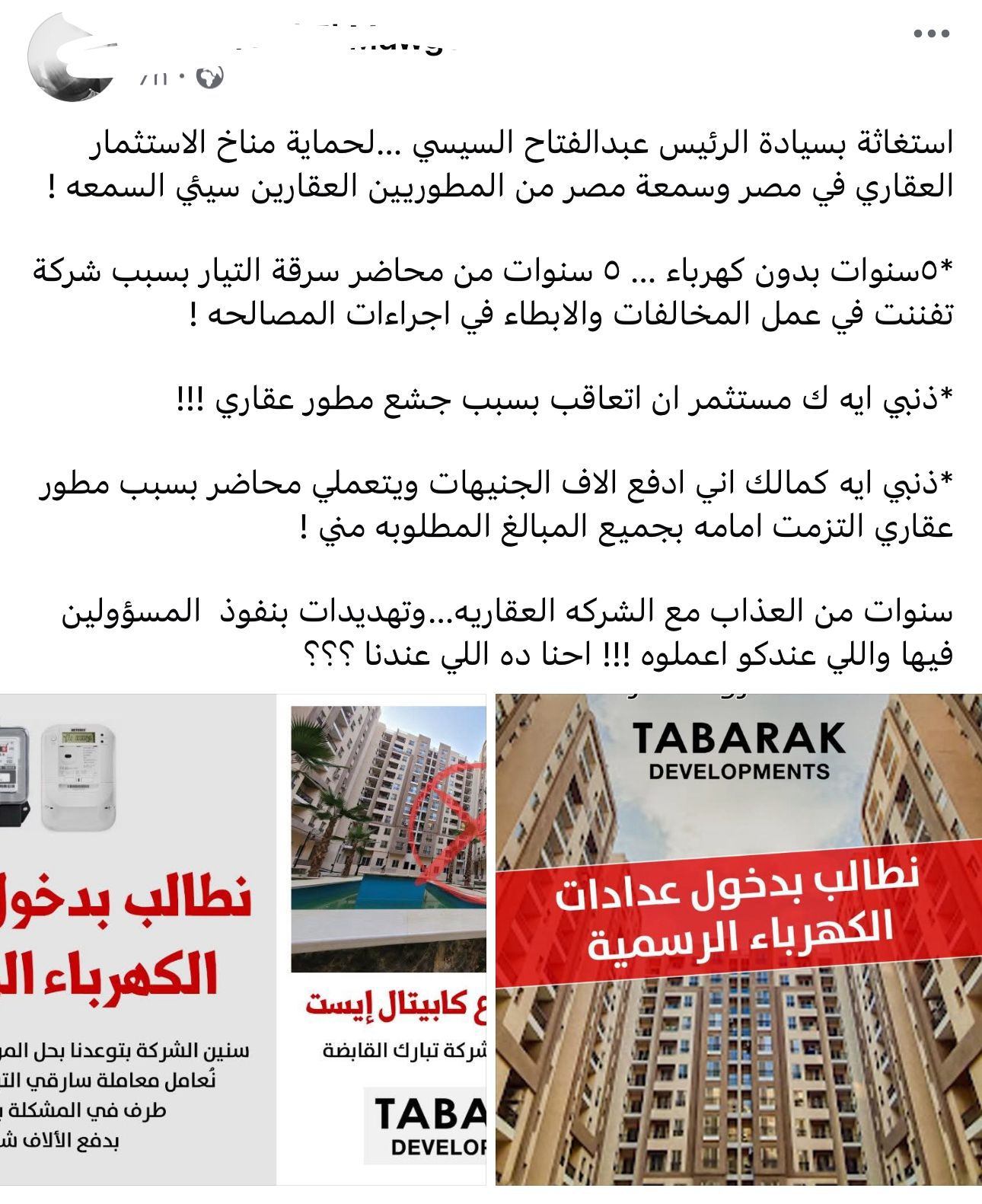وقال المتضررون: استغاثة بسيادة الرئيس عبدالفتاح السيسي …لحماية مناخ الاستثمار العقاري في مصر وسمعة مصر من المطوريين العقارين سيئي السمعه 5 سنوات بدون كهرباء .. 5 سنوات من محاضر سرقة التيار بسبب شركة تفننت في عمل المخالفات والابطاء في اجراءات المصالحه ! ذنبي ايه كمستثمر ان اتعاقب بسبب جشع مطور عقاري !!!