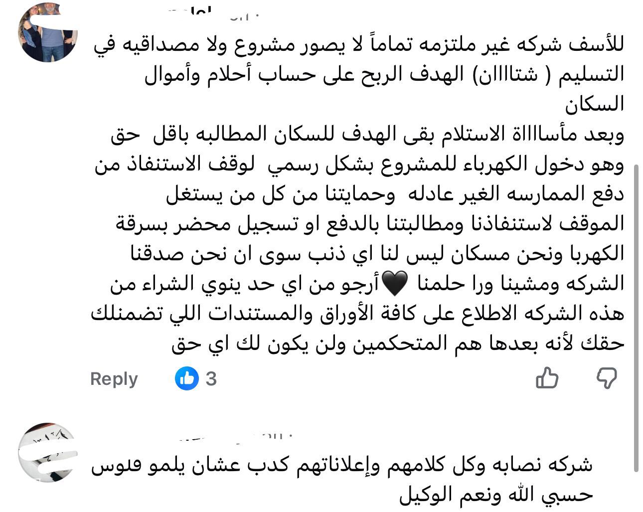 واشتكي اخر قائلا: للأسف شركه غير ملتزمة تماماً لا يصور مشروع ولا مصداقيه في التسليم ( شتان) الهدف الربح على حساب أحلام وأموال السكان وبعد مأساة الاستلام بقى الهدف للسكان المطالبه باقل حق وهو دخول الكهرباء للمشروع بشكل رسمي لوقف الاستنفاذ من دفع الممارسة الغير عادلة وحمايتنا من كل من يستغل الموقف لاستنفاذنا ومطالبتنا بالدفع او تسجيل محضر بسرقة الكهرباء ونحن سكان ليس لنا اي ذنب سوى ان نحن صدقنا الشركة ومشينا ورا حلمنا أرجو من اي حد ينوي الشراء من هذه الشركة الاطلاع على كافة الأوراق والمستندات اللي تضمنلك حقك لأنه بعدها هم المتحكمين ولن يكون لك اي حق.