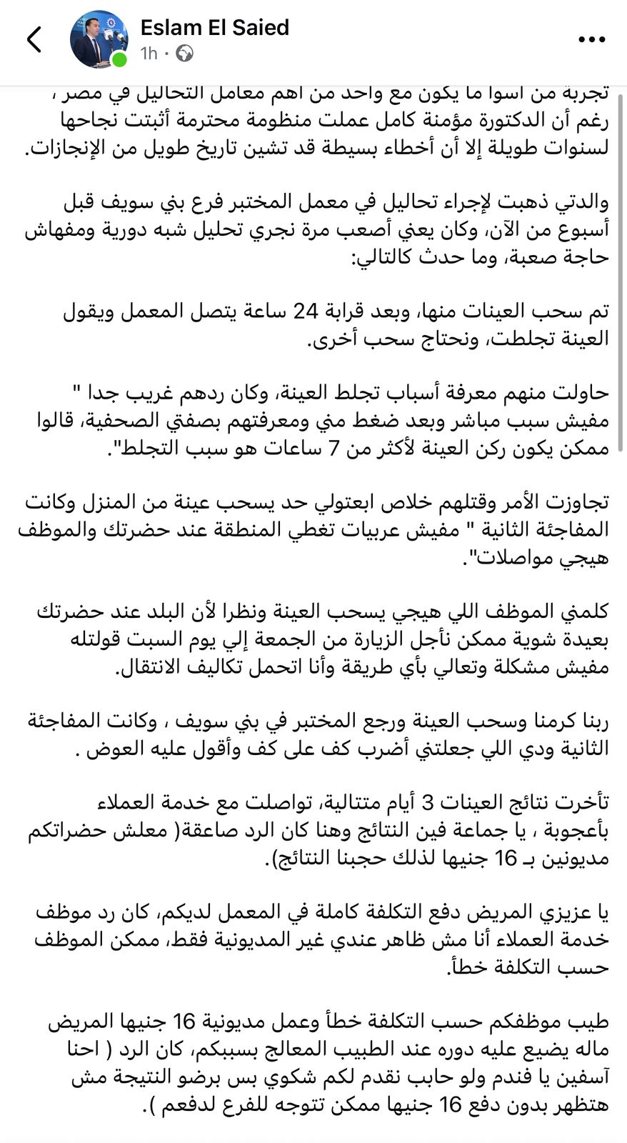 وقال عن تجربته مع معمل المختبر: يا عزيزي المريض دفع التكلفة كاملة في المعمل لديكم، كان رد موظف خدمة العملاء أنا مش ظاهر عندي غير المديونية فقط، ممكن الموظف حسب التكلفة خطأ..طيب موظفكم حسب التكلفة خطأ وعمل مديونية 16 جنيها المريض ماله يضيع عليه دوره عند الطبيب المعالج بسببكم، كان الرد ( احنا آسفين يا فندم ولو حابب نقدم لكم شكوي بس برضو النتيجة مش هتظهر بدون دفع 16 جنيها ممكن تتوجه للفرع لدفعم ).