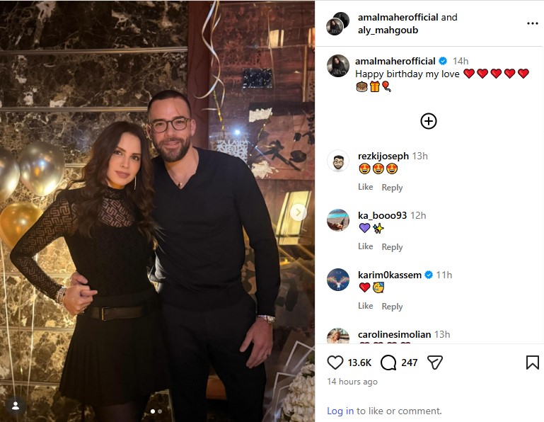 حيث نشرت الفنانة آمال ماهر، صور جلسة تصوير لها علي حسابها الرسمي بموقع انستجرام، وعلق زوجها قائلًا: «فخور بكِ يا كل شيء بالنسبة لي، لترد عليه آمال ماهر مؤكدة: قلبي.. أحبك».