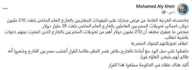 وأضاف خير أن التركيز على عائد محدود من الجمارك، مقابل المخاطرة بعلاقة الدولة بأبنائها في الخارج، يمثل قصر نظر شديد الخطورة، خاصة في ظل تصاعد حالة الغضب بين المصريين بالخارج، وانتشار دعوات تطالب بوقف أو تقليص التحويلات البنكية إلى مصر.