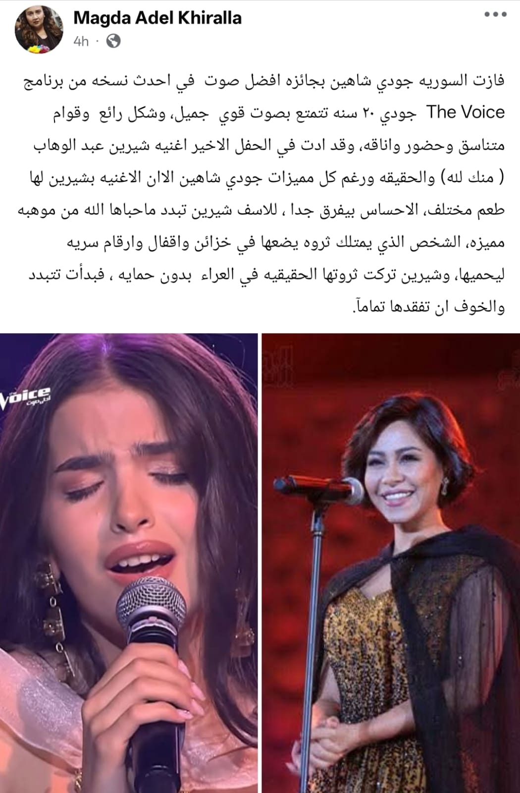 وكتبت ماجدة خير الله من خلال حسابها الرسمي عبر موقع التواصل الاجتماعي «فيسبوك»، قالت: "فازت السوريه جودي شاهين بجائزه أفضل صوت في احدث نسخه من برنامج The Voice جودي ٢٠ سنة تتمتع بصوت قوي جميل، وشكل رائع وقوام متناسق وحضور واناقه، وقد ادت في الحفل الأخير أغنية شيرين عبد الوهاب ( منك لله) والحقيقه ورغم كل مميزات جودي شاهين الا ان الاغنيه بشيرين لها طعم مختلف، الاحساس بيفرق جدا".