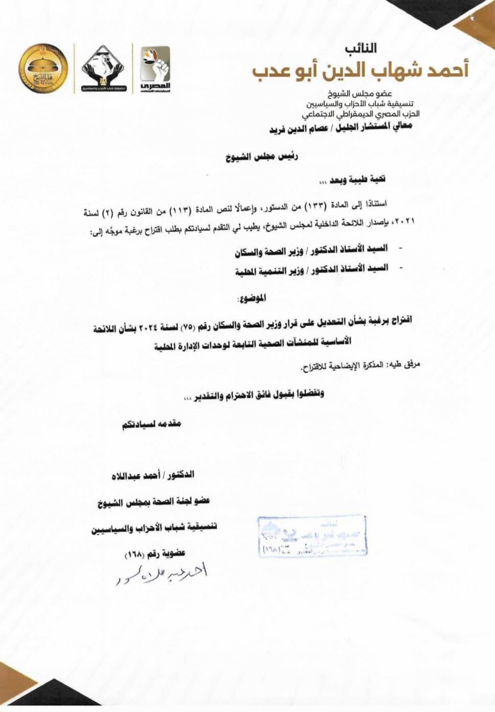 تقدم النائب أحمد عبد الله عضو مجلس الشيوخ عن الحزب المصري الديمقراطي الاجتماعي باقتراح برغبة إلى المستشار عصام فريد، رئيس مجلس الشيوخ، موجه إلى وزير الصحة والسكان ووزير التنمية المحلية، بشأن التعديل على قرار وزير الصحة والسكان رقم (75) لسنة 2024 الخاص باللائحة الأساسية للمنشآت الصحية التابعة لوحدات الإدارة المحلية.