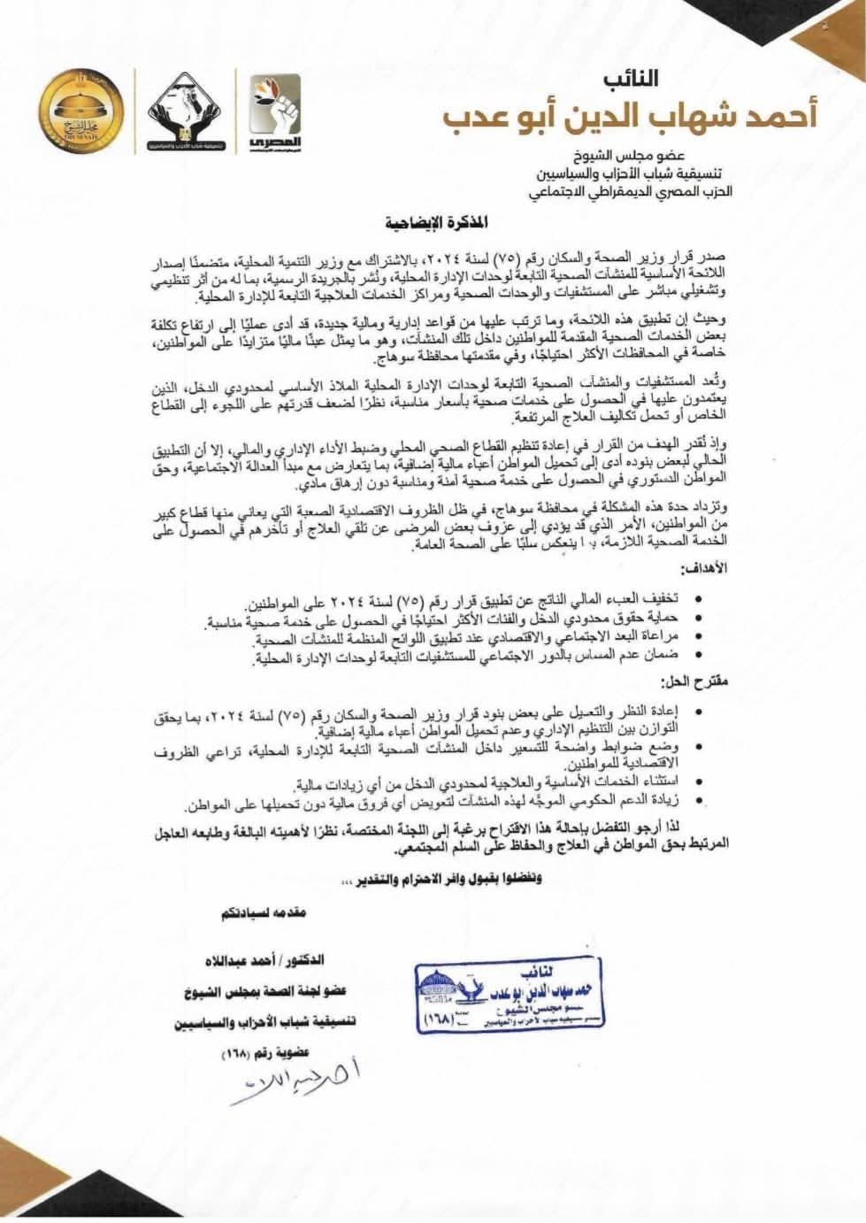 وأشار إلى أن تطبيق هذه اللائحة، وما ترتب عليها من قواعد إدارية ومالية جديدة، قد أدى عمليًا إلى ارتفاع تكلفة بعض الخدمات الصحية المقدمة للمواطنين داخل تلك المنشآت، وهو ما يمثل عبئًا ماليًا متزايدًا على المواطنين، خاصة في المحافظات الأكثر احتياجًا، وفي مقدمتها محافظة سوهاج.