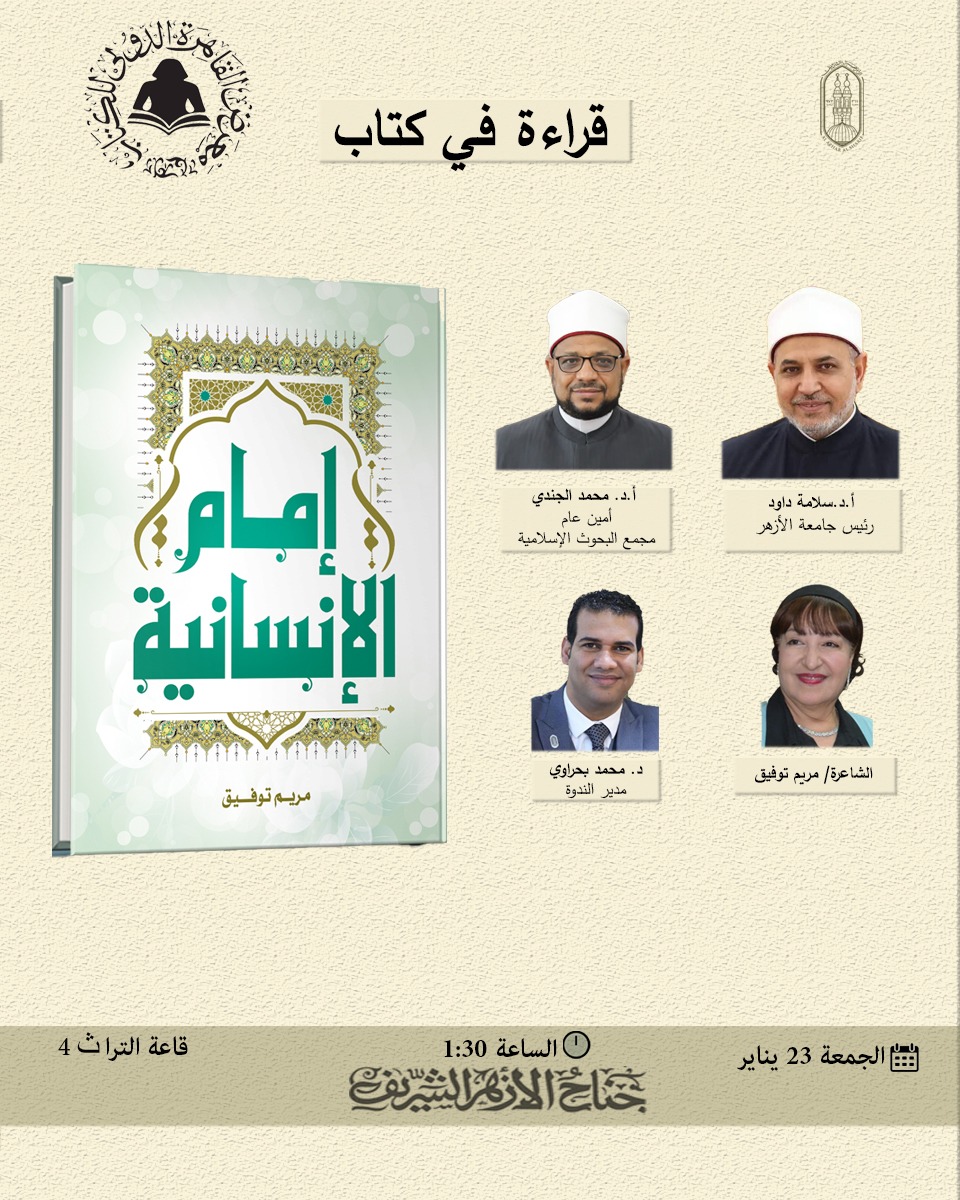 ويعقد جناح الأزهر ندوة بعنوان "قراءة في كتاب إمام الإنسانية" للشاعرة مريم توفيق، وذلك في تمام الساعة ١:٣٠ ظهرا، يحاضر فيها فضيلة الدكتور سلامة داوود، رئيس جامعة الأزهر ، وفضيلة الدكتور محمد الجندي، الأمين العام لمجمع البحوث الإسلامية، ويديرها الدكتور محمد البحراوي، عضو هيئة التدريس بكلية الإعلام جامعة الأزهر.