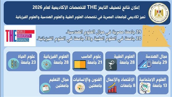 أعلن تصنيف التايمز للتعليم العالي للتخصصات الأكاديمية Times Higher Education World University Rankings by Subject (THE) نتائجه لعام 2026، والتي أبرزت تميز الجامعات المصرية في معظم التخصصات الأكاديمية التي شملها التصنيف، فضلًا عن تحقيق زيادة في أعداد الجامعات المُدرجة في العديد من التخصصات مقارنة بنتائج التصنيف للعام الماضي 2025.