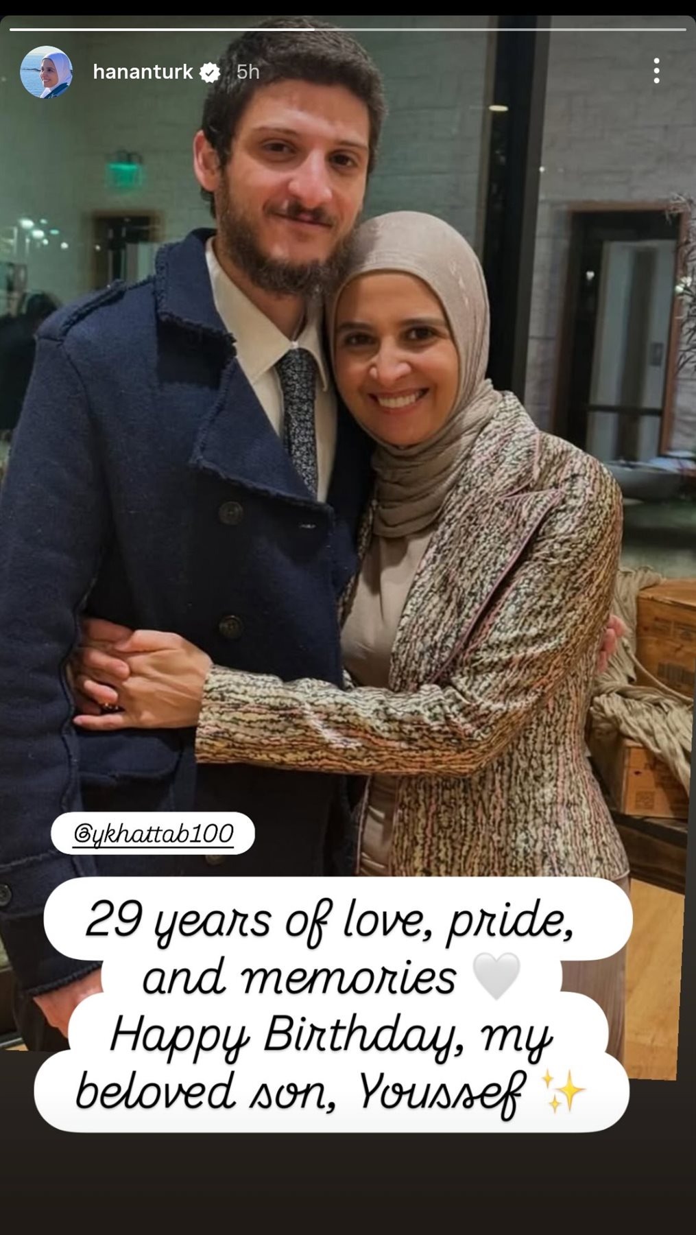 وأعربت حنان ترك عن مدى حبها وفخرها بنجلها، حيث نشرت صورة تجمعهما، من خلال حسابها الرسمي عبر موقع تبادل الصور والفيديوهات القصيرة «إنستجرام»، عبر خاصية ستوري، وكتبت: «29 سنة من الحب، الفخر والذكريات.. عيد ميلاد سعيد ابني الحبيب يوسف».