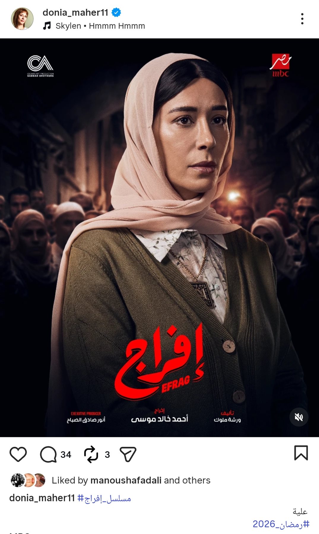 كشفت الفنانة دنيا ماهر عن شخصيتها في مسلسل إفراج بطولة الفنان عمرو سعد، الذي يخوض به السباق الرمضاني 2026.