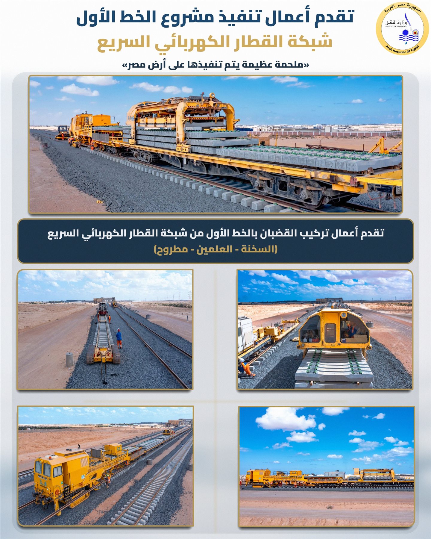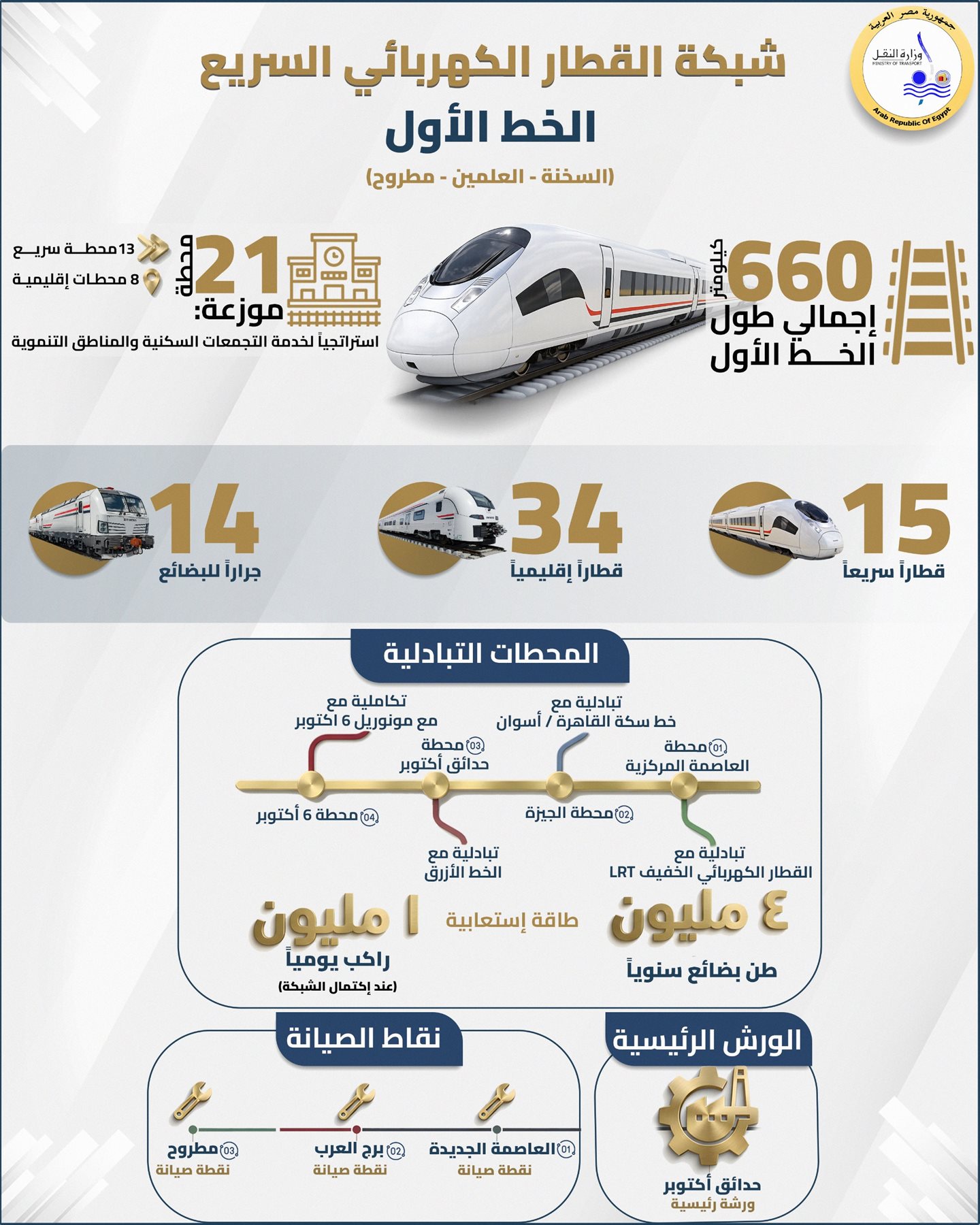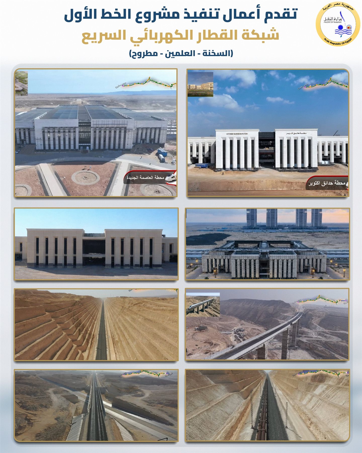 قام الفريق مهندس كامل الوزير نائب رئيس مجلس الوزراء للتنمية الصناعية وزير الصناعة والنقل بتفقد مواقع العمل بالخط الأول من شبكة القطار الكهربائي السريع «السخنة/ العلمين/ مطروح »والذي يبلغ طوله 660 كم، ويدخل ضمن الممر اللوجستي السخنة/ الدخيلة، وذلك في المسافة من أكتوبر حتى برج العرب لمتابعة التقدم في معدلات التنفيذ بالمشروع "أعمال التشطيبات بالمحطات - تنفيذ الاعمال الصناعية (كباري - أنفاق) - اعمال تركيب القضبان على السكة – أعمال تركيب اعمدة الكهرباء الكاتنيري".