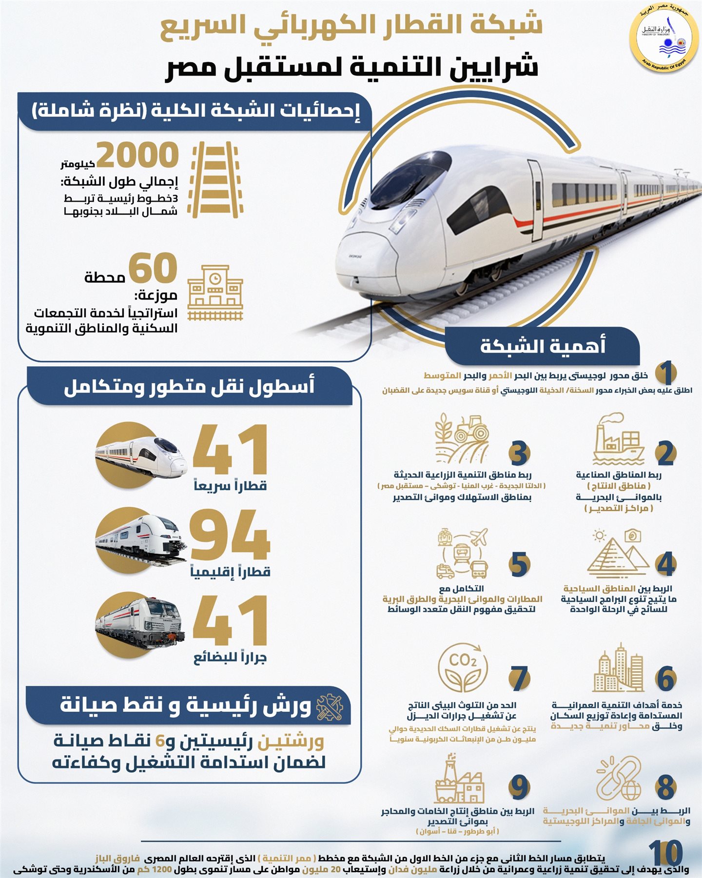 ولفت الوزير، إلى أهمية تنفيذ شبكة القطار الكهربائي السريع والتي تعتبر شرايين تنمية جديدة ستخدم المناطق العمرانية والصناعية الجديدة والقائمة، مثل المناطق الصناعية في (حلوان و15 مايو وبرج العرب والسادس من أكتوبر والمنيا الجديدة وأسيوط الجديدة وغيرها من المناطق الصناعية)، وكذلك خدمة المناطق السياحية (الثقافية والتاريخية والدينية والشاطئية) مثل المناطق السياحية في (الجيزة وسوهاج والأقصر وأسوان وأبو سمبل والبحر الأحمر) وغيرها من الأماكن السياحية الأخرى في مصر وخدمة المناطق الزراعية الجديدة سواء في الدلتا الجديدة او مستقبل مصر أو جنة مصر وغرب المنيا وتوشكي وشرق العوينات، وكذلك المساهمة في خلق محاور لوجستية تربط بين البحر الأحمر والبحر المتوسط، وشمال وجنوب البلاد وربط المناطق الصناعية (مناطق الإنتاج) بالموانئ البحرية (مراكز التصدير) كما انها توفر الاف من فرص العمل للشباب.