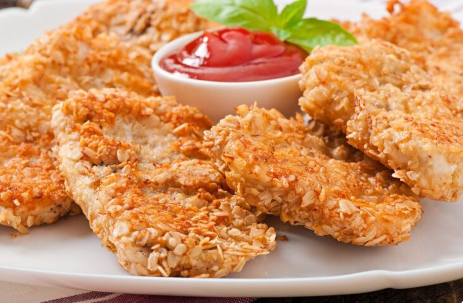 - بعد ذلك، قومي بأخذ قليل من الفراخ المفرومة، وتكوينها شريحة فراخ بانيه، ووضعها في الدقيق ثم البيض والكورن فليكس المطحون للقرمشة.