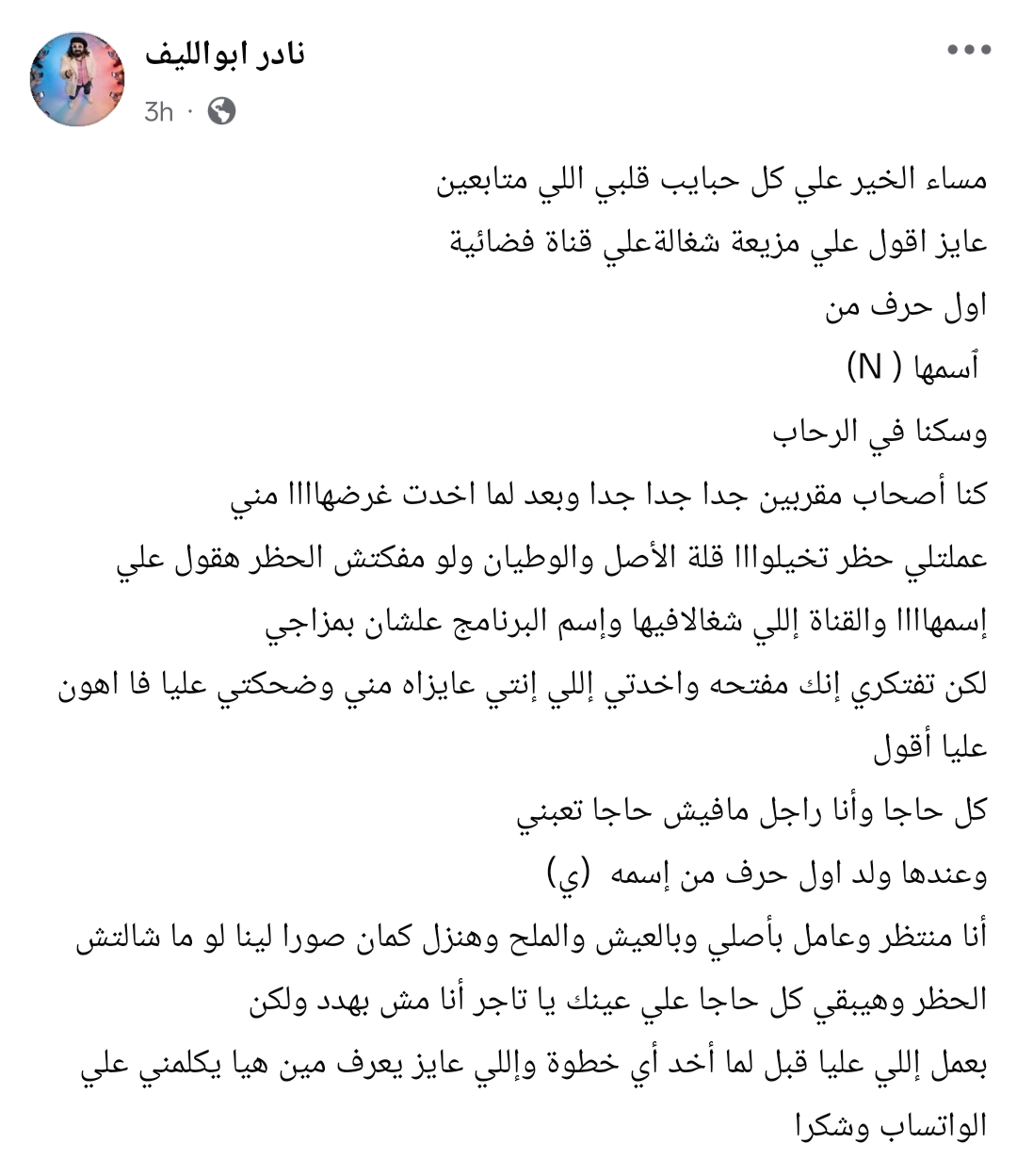 وكتب من خلال حسابه الرسمي عبر موقع التواصل الاجتماعي فيسبوك، قال: مساء الخير علي كل حبايب قلبي اللي متابعين عايز اقول علي مذيعة شغالة علي قناة فضائية اول حرف من أسمها ( N)
