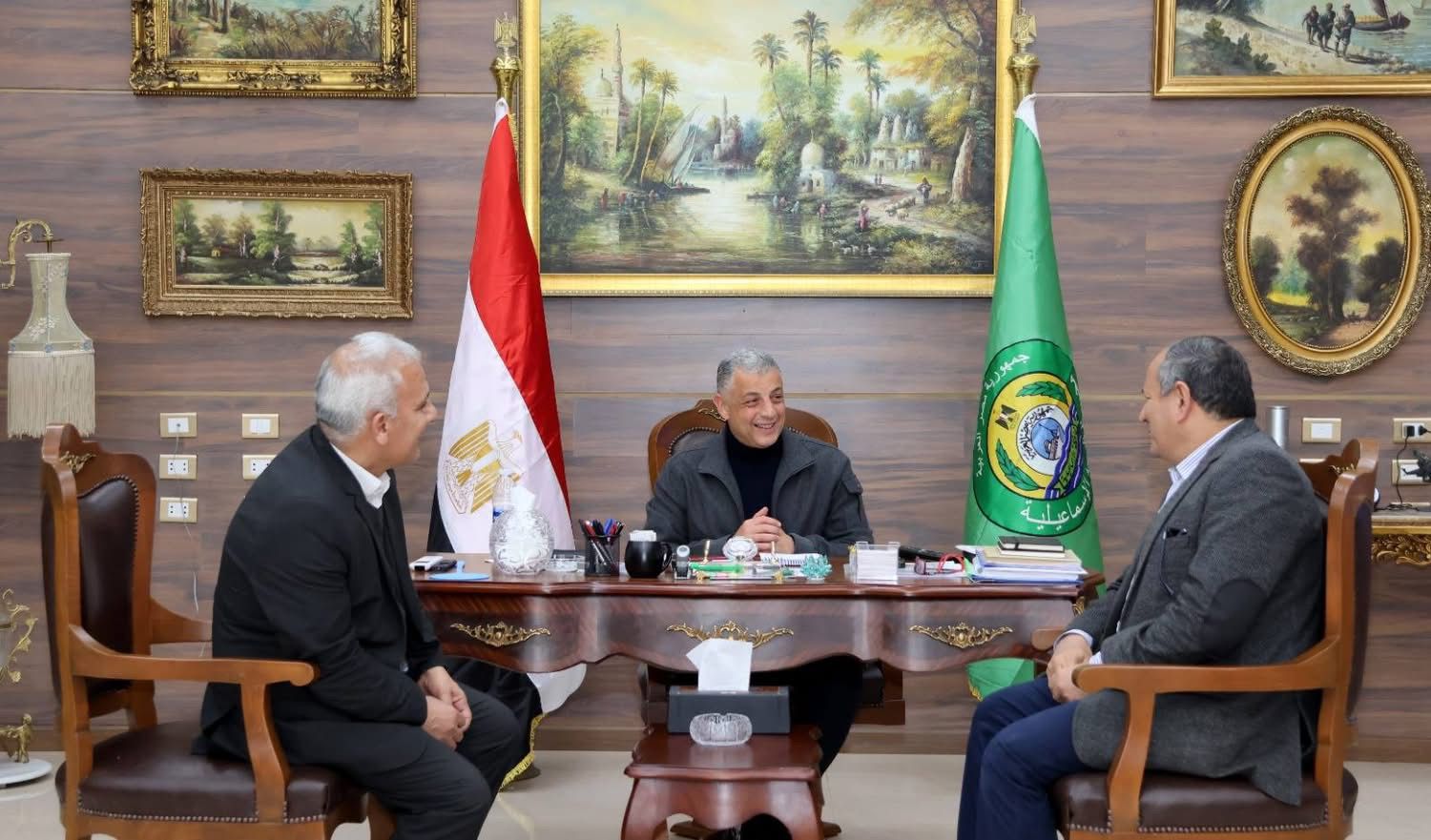 استقبل اللواء طيار أ.ح أكرم محمد جلال محافظ الإسماعيلية، بمكتبه اليوم السبت، الدكتور عادل عبد العظيم رئيس مركز البحوث الزراعية بوزارة الزراعة واستصلاح الأراضي، والوفود المرافق له، في إطار استقبال محافظة الإسماعيلية قافلة علمية خدمية إرشادية موسعة في كل مجالات الزراعة (الإنتاج النباتي، الإنتاج الحيواني – المكافحة - التحصينات واللقاحات البيطرية)، والتي ينظمها مركز البحوث الزراعية بوزارة الزراعة واستصلاح الأراضي.
