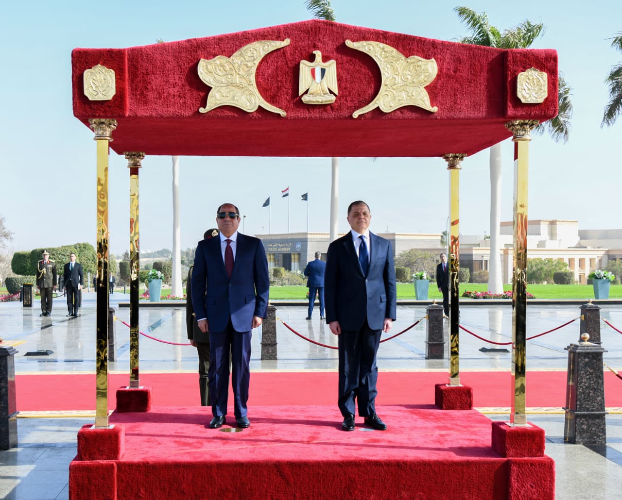 وصرح المتحدث الرسمي باسم رئاسة الجمهورية بأن حرس الشرف أدّى التحية العسكرية، وعزف السلام الوطني لجمهورية مصر العربية، ثم توجه الرئيس إلى النصب التذكاري لوضع أكليل من الزهور، وعزفت الموسيقى سلام الشهيد، ثم صافح سيادته السادة كبار رجال الدولة وأعضاء المجلس الأعلى للشرطة.