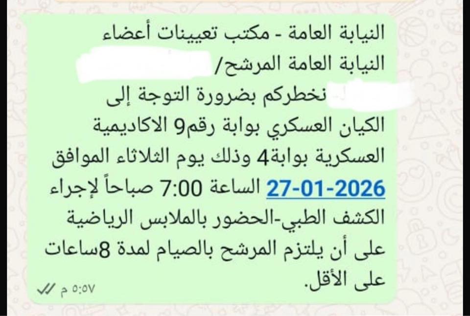 وينص هذا المستند .. نخطركم بضرورة التوجة الى الكيان العسكري بوابة رقم 9 الاكاديمية العسكرية بوابوة رقم 4 وذلك يوم الثلاثاء الموافق 27 يناير لاجراء الكشف الطبي ، والحضور بالملابس الرياضية على ان يلتزم المرشح بالصيام لمدة 8 ساعات على الأقل".