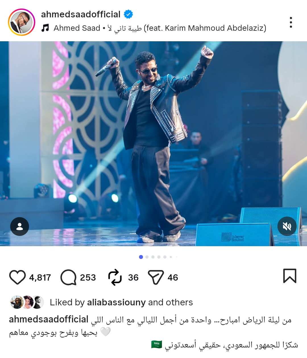 وشارك أحمد سعد جمهوره صورا من الحفل، من خلال حسابه الرسمي عبر موقع تبادل الصور والفيديوهات القصيرة إنستجرام، وعلق: "من ةيلة الرياض امبارح.. واحدة من أجمل الليالي مع الناس اللي بحبها وبفرح بوجودي معاهم".