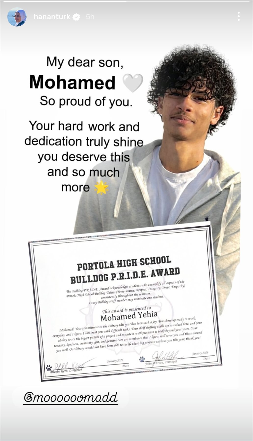 ونشرت حنان ترك شهادة تقدير لنجلها، من خلال حسابها الرسمي عبر موقع تبادل الصور والفيديوهات القصيرة إنستجرام، عبر خاصية ستوري، وكتبت: ابني الحبيب، محمد