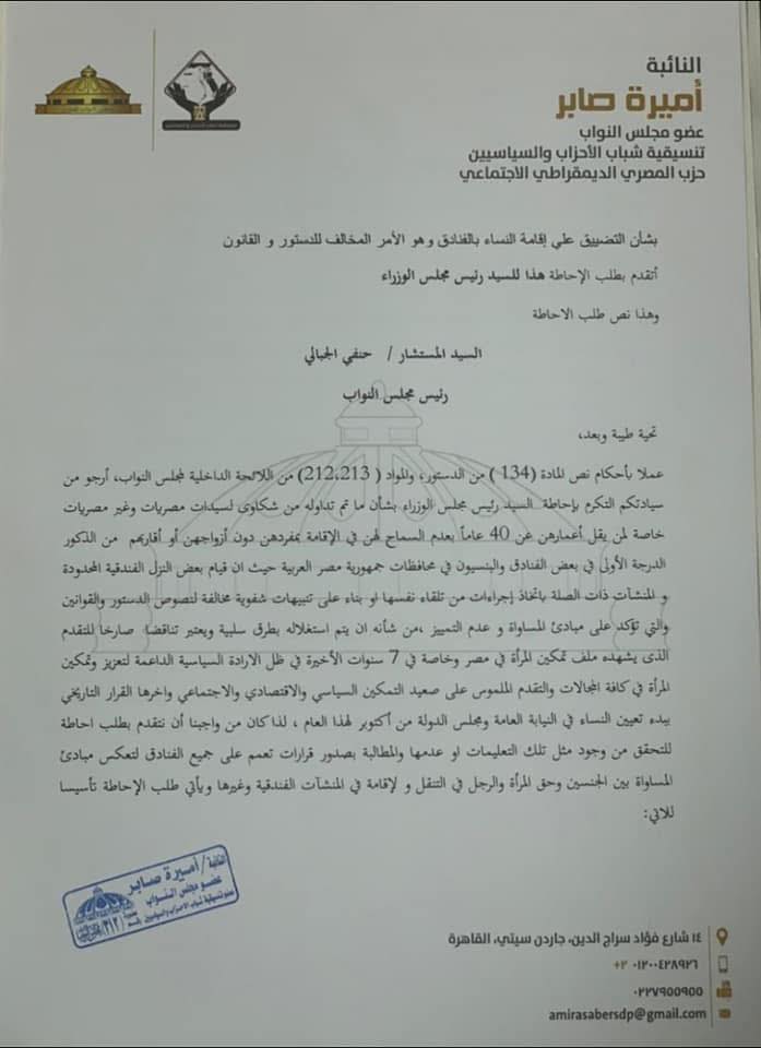 وأضافت النائبة أنها كانت قد تقدمت بطلب إحاطة عام 2021 موجه إلى رئيس مجلس الوزراء، وأسهمت وسائل الإعلام حينها في تغطية معتبرة للأمر، حيث ردت وزارة الداخلية ببيان نفّت جملة وتفصيلاً وجود أي تعليمات تمنع النساء من الإقامة في الفنادق، كما أعلنت غرفة المنشآت الفندقية عن فتح خط ساخن لتلقي شكاوى النزيلات حال تعرضهن لأي منع.