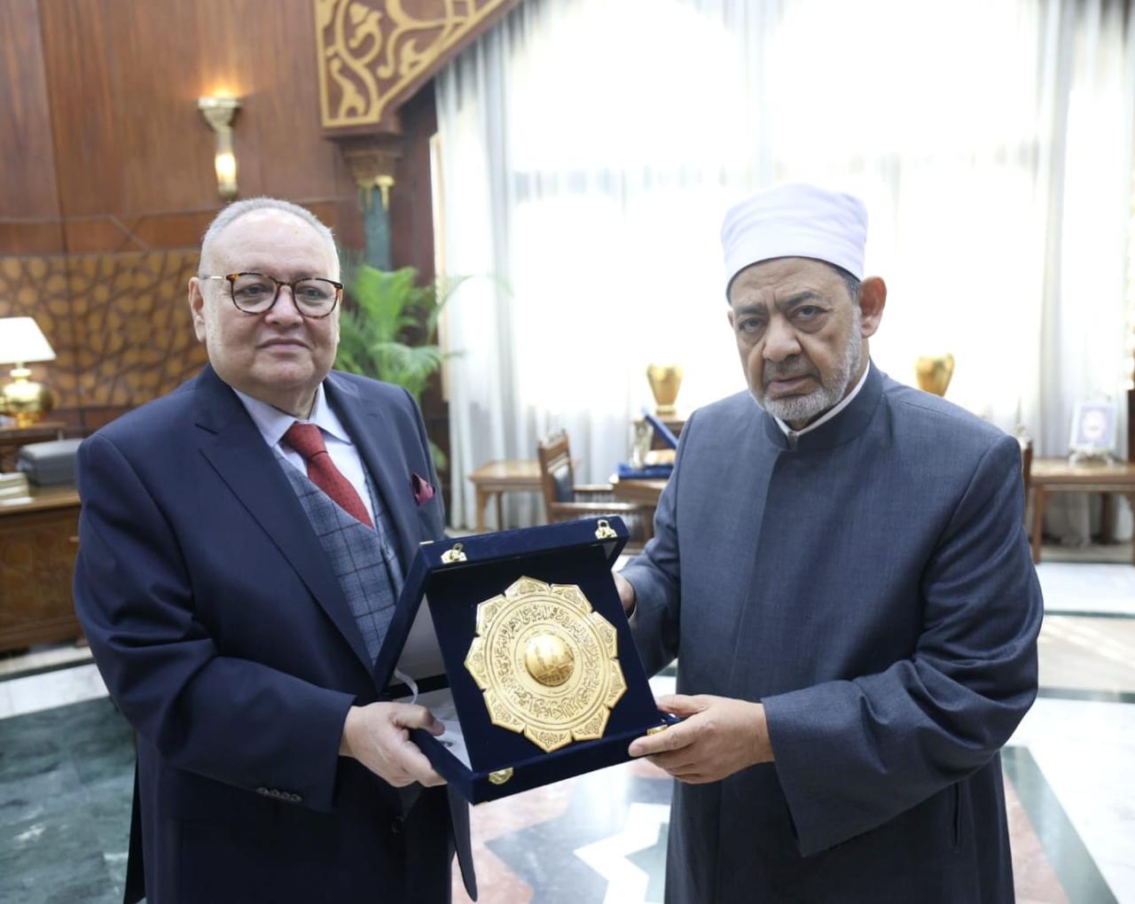 وفي نهاية اللقاء، أهدى رئيس مجلس الدولة دِرْعَ المجلس لفضيلة الإمام الأكبر، كما أهدى فضيلته رئيس المجلس دِرْعَ الأزهر الشريف وكتاب "الإمام والبابا والطريق الصعب" لمؤلِّفه القاضي محمد عبد السَّلام.