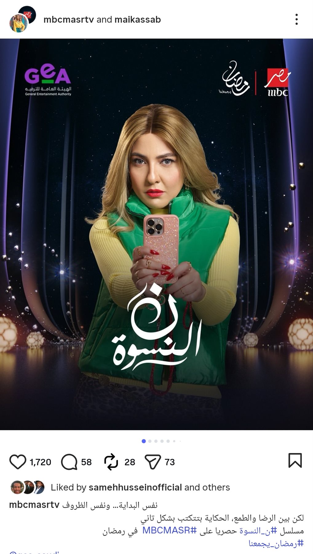 وشاركت مي كساب جمهورها البوستر الفردي لها في العمل، من خلال حسابها الرسمي عبر موقع تبادل الصور والفيديوهات القصيرة إنستجرام، وعلقت: نفس البداية... ونفس الظروف لكن بين الرضا والطمع الحكاية بتتكتب بشكل تاني.. مسلسل ن النسوة حصريا على MBCMASR في رمضان.