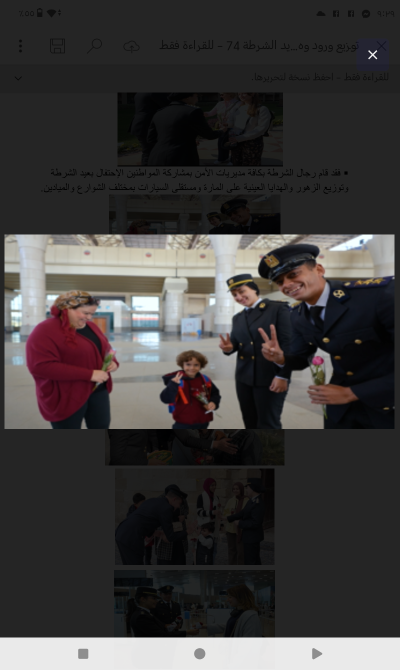 فقد قام رجال الشرطة بكافة مديريات الأمن بمشاركة المواطنين الإحتفال بعيد الشرطة وتوزيع الزهور والهدايا العينية على المارة ومستقلى السيارات بمختلف الشوارع والميادين.