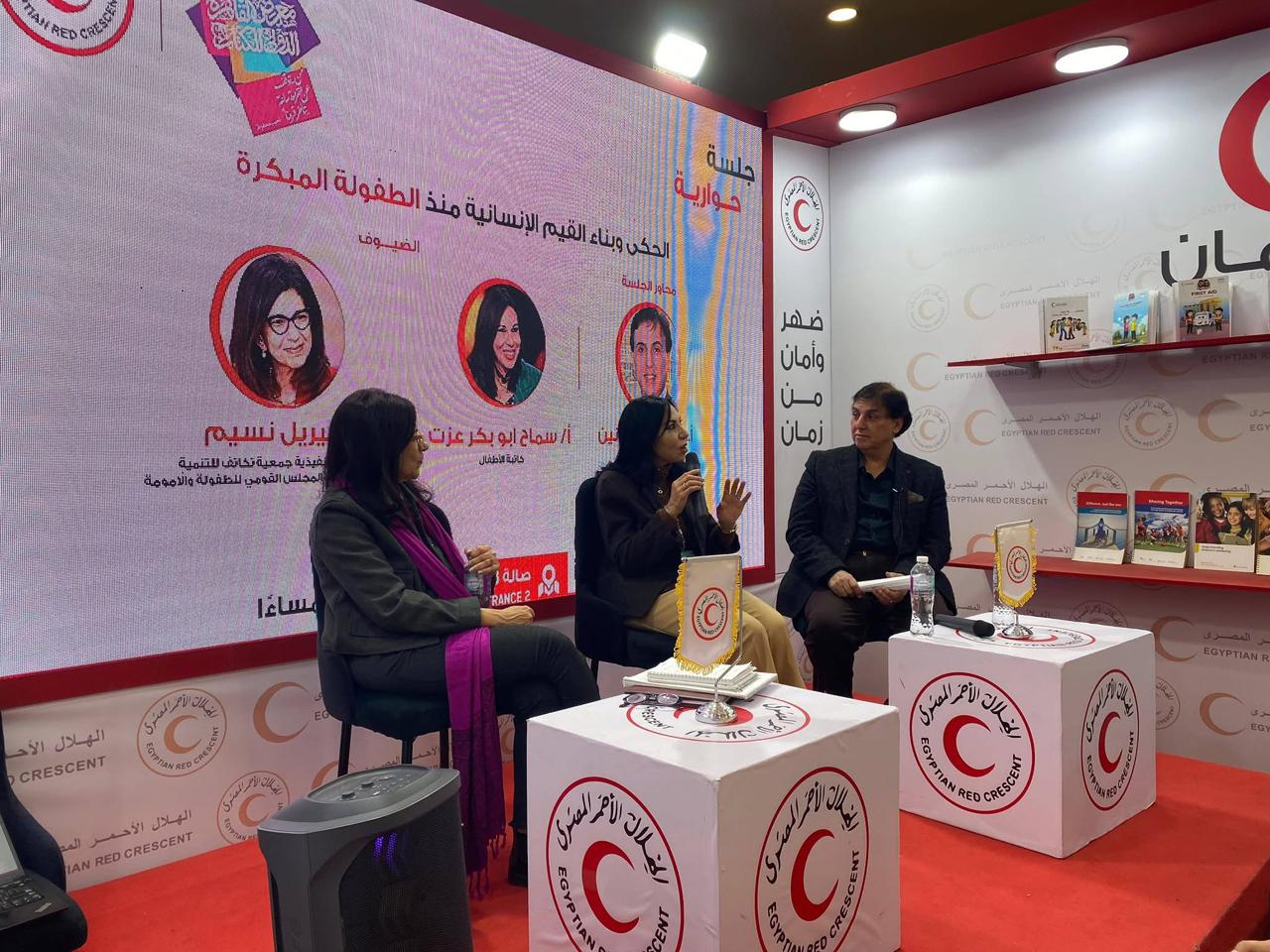 وفي إطار الاهتمام ببناء الوعي الإنساني منذ الطفولة، نظم الهلال الأحمر المصري جلسة حوارية بعنوان «الحكي وبناء القيم الإنسانية منذ الطفولة المبكرة»، أدارها الدكتور فتوح حسانين أستاذ طب الأطفال، وبمشاركة الكاتبة المتخصصة في أدب الطفل سماح أبو بكر عزت، وميار نسيم عضو مجلس إدارة المجلس القومي للطفولة والأمومة.