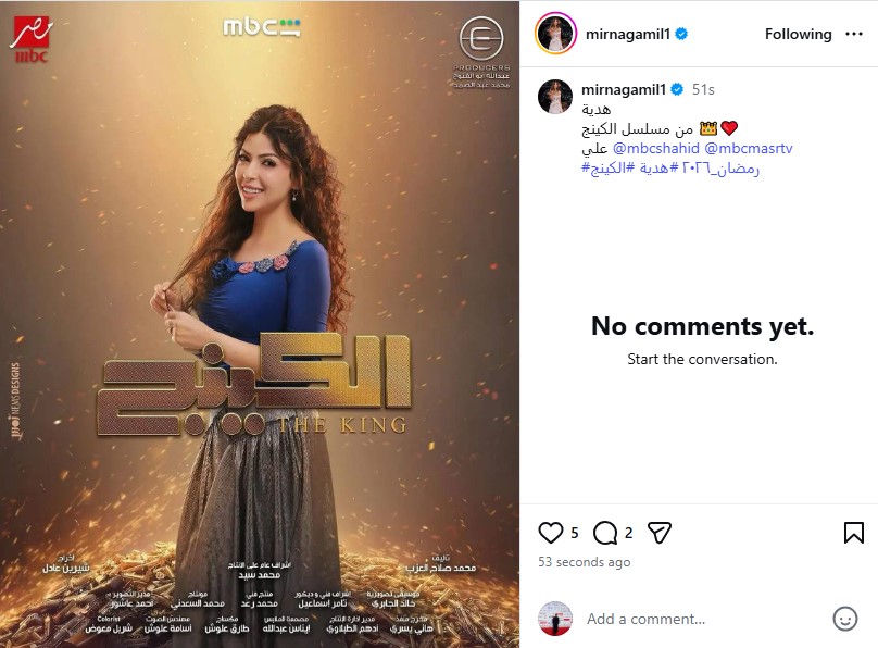 وكتبت ميرنا جميل من خلال حسابها الرسمي عبر موقع تبادل الصور والفيديوهات القصيرة إنستجرام، قالت: هدية من مسلسل الكينج على mbc مصر وشاهد.