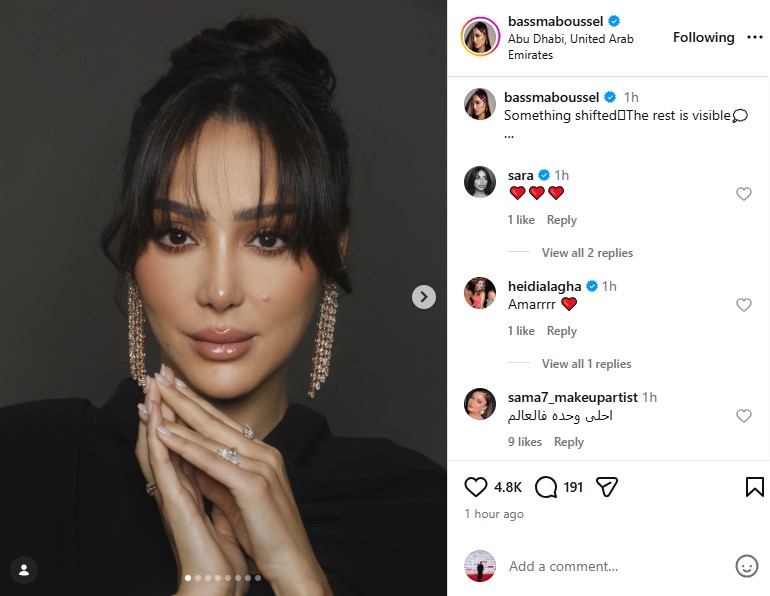 وشاركت بسمة بوسيل جمهورها صورا من أحدث جلسة تصوير لها، وذلك من خلال حسابها الرسمي عبر موقع تبادل الصور والفيديوهات القصيرة إنستجرام، وعلقت: حدث تغير ما، اما الباقي فهو واضح.