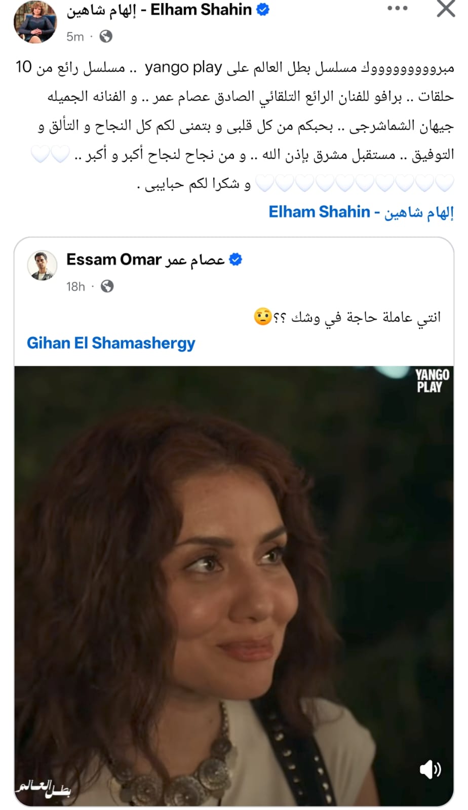 وأعادت إلهام شاهين نشر المقطع، من خلال حسابها الرسمي عبر موقع التواصل الاجتماعي فيسبوك، وعلقت: «مبروووووووووك مسلسل بطل العالم على yango play.. مسلسل رائع من 10 حلقات.. برافو للفنان الرائع التلقائي الصادق عصام عمر.. و الفنانه الجميله جيهان الشماشرجى.. بحبكم من كل قلبى و بتمنى لكم كل النجاح و التألق و التوفيق.. مستقبل مشرق بإذن الله.. و من نجاح لنجاح أكبر و أكبر.. و شكرا لكم حبايبى».