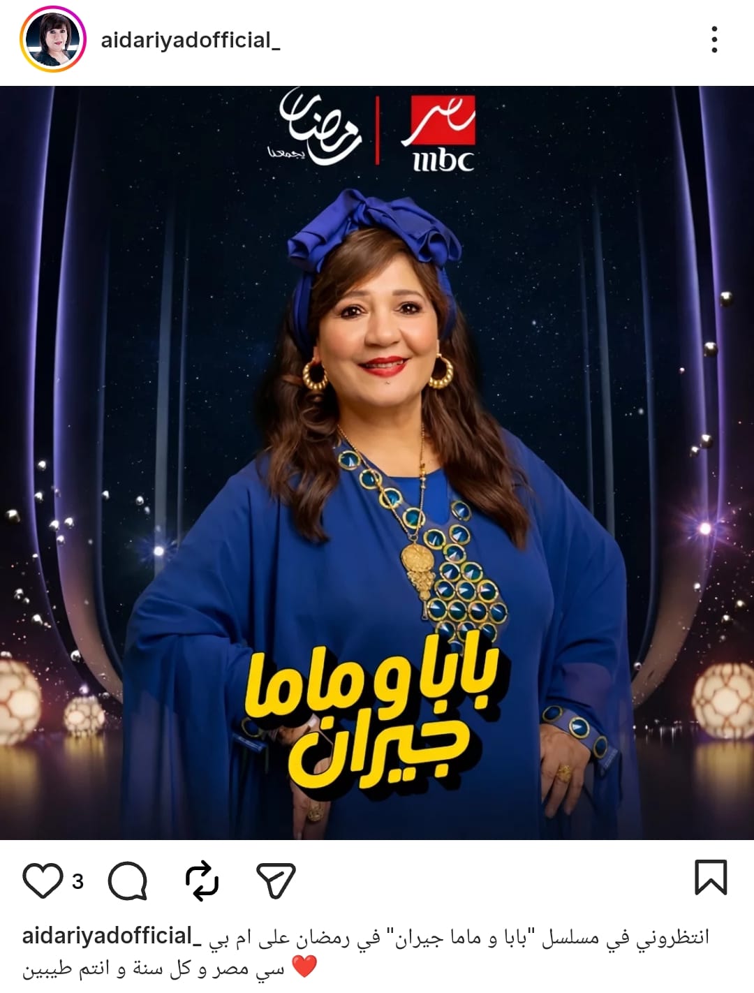 ونشرت عايدة رياض البوستر الفردي لها في مسلسل «بابا وماما جيران»، من خلال حسابها الرسمي عبر موقع تبادل الصور والفيديوهات القصيرة إنستجرام، وعلقت: «انتظروني في مسلسل بابا وماما جيران في رمضان على إم بي سي مصر، وكل سنة وانتم طيبين».