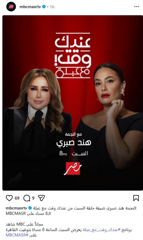 وأعلنت الصفحة الرسمية لـ قناة إم بي سي مصر عن موعد الحلقة، التي من المقرر إذاعتها في تمام الساعة 8 مساءًا، وكتبت من خلال حسابها عبر موقع تبادل الصور والفيديوهات القصيرة إنستجرام، قالت: النجمة هند صبري ضيفة حلقة السبت من عندك وقت مع عبلة 8 مساءًا على MBC مصر.