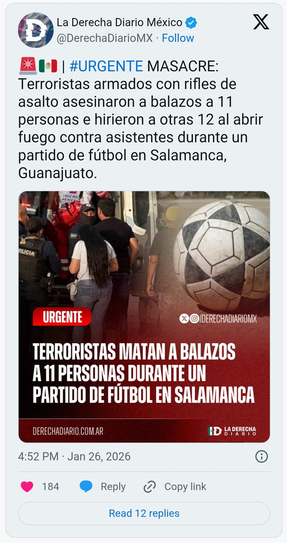 أعلن سيزار برييتو، رئيس بلدية مدينة سالامانكا المكسيكية، عن مقتل 11 شخصاً وإصابة 12 آخرين، بينهم امرأة وطفلة، في هجوم مسلح مروع وقع في ملعب لكرة القدم بالمدينة مساء أمس الأحد.