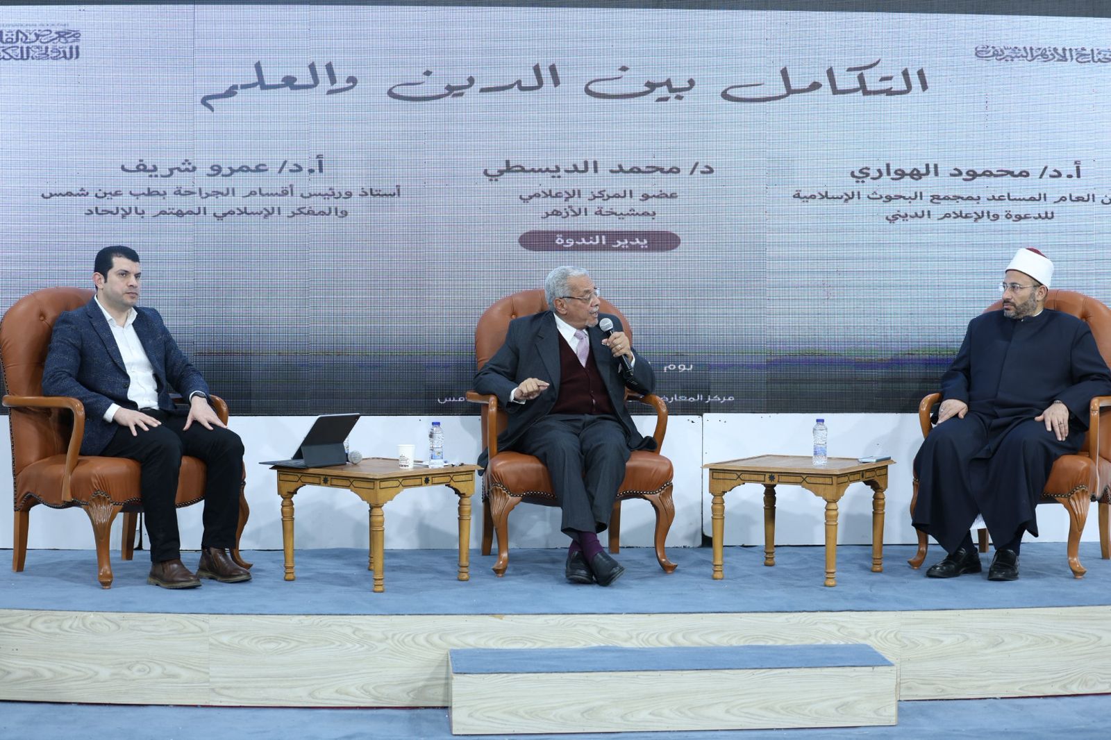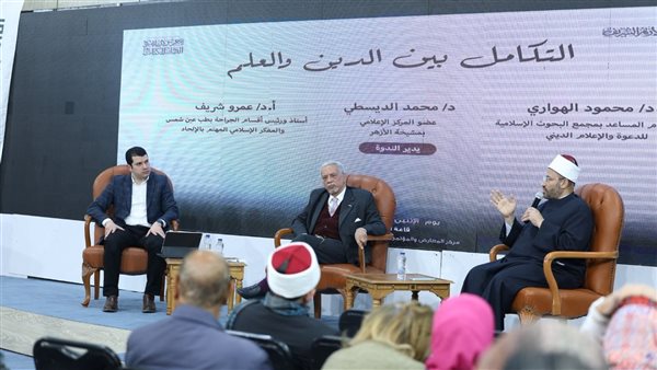 نظم جناح الأزهر الشريف بمعرض القاهرة الدولي للكتاب في دورته السابعة والخمسين، اليوم الاثنين، ندوة بعنوان "التكامل بين العلم والدين، بمشاركة الأستاذ الدكتور/ محمود الهواري الأمين العام المساعد للدعوة والإعلام الديني بمجمع البحوث الإسلامية، والأستاذ الدكتور/ عمرو شريف أستاذ ورئيس أقسام الجراحة بطب عين شمس والمفكر المهتم بقضايا الإلحاد، وأدار الندوة الإعلامي/ محمد الديسطي، عضو المركز الإعلامي بمشيخة الأزهر.