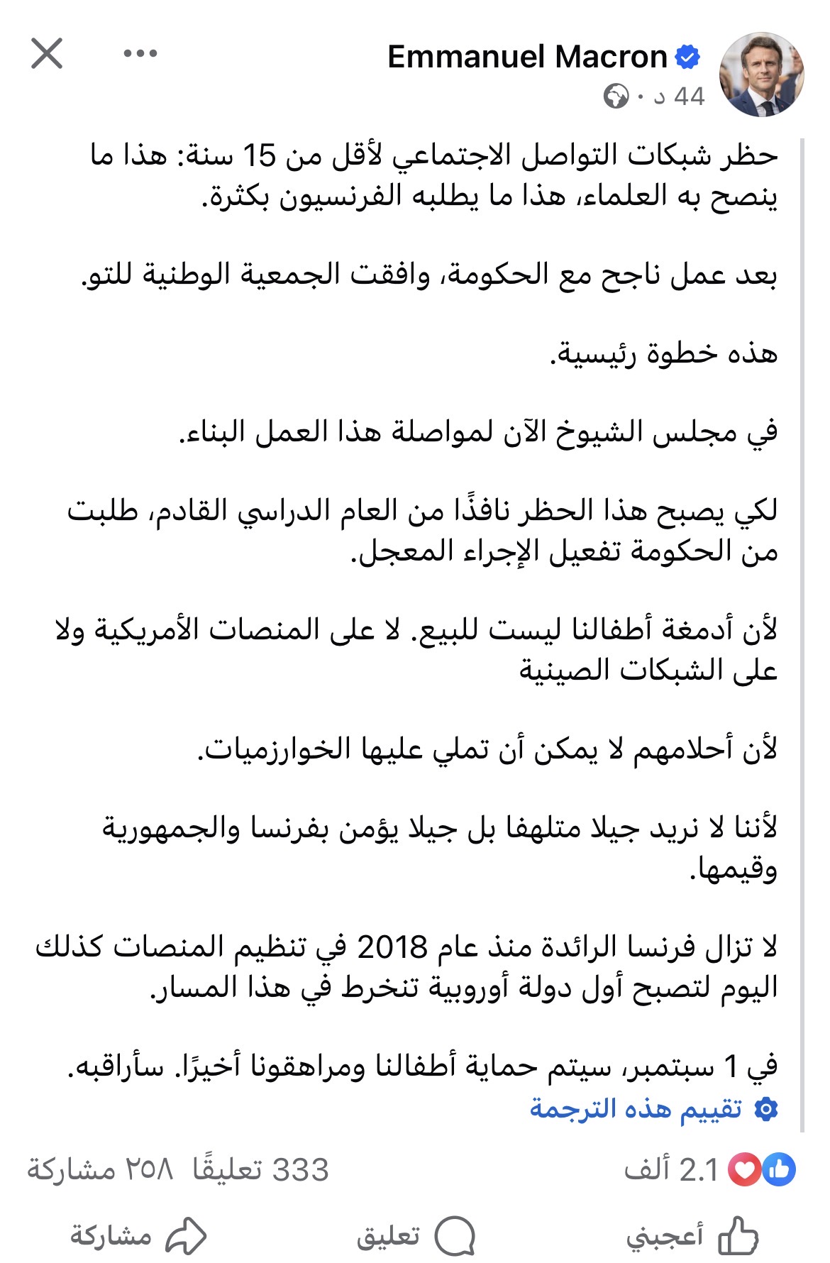 وأشار الرئيس الفرنسي إلى أن المشروع دخل حاليًا مرحلة المناقشة داخل مجلس الشيوخ، تمهيدًا لاستكمال الإجراءات التشريعية، مع مطالبة الحكومة بتفعيل آلية "الإجراء المعجل" لضمان دخول القرار حيز التنفيذ مع بداية العام الدراسي المقبل.