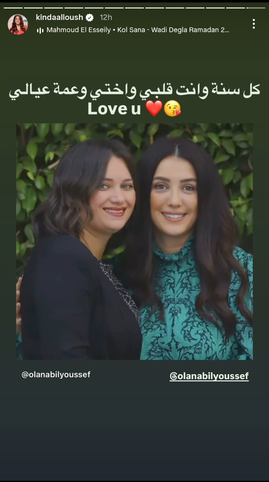 ونشرت كندة علوش مقطع فيديو به صورهما على أغنية كل سنة وانت طيب، من خلال حسابها الرسمي عبر موقع تبادل الصور والفيديوهات القصيرة إنستجرام، عبر خاصية ستوري، ووجهت رسالة تهنئة، وكتبت: كل سنة وانت قلبي واختي وعمة عيالي.. بحبك.