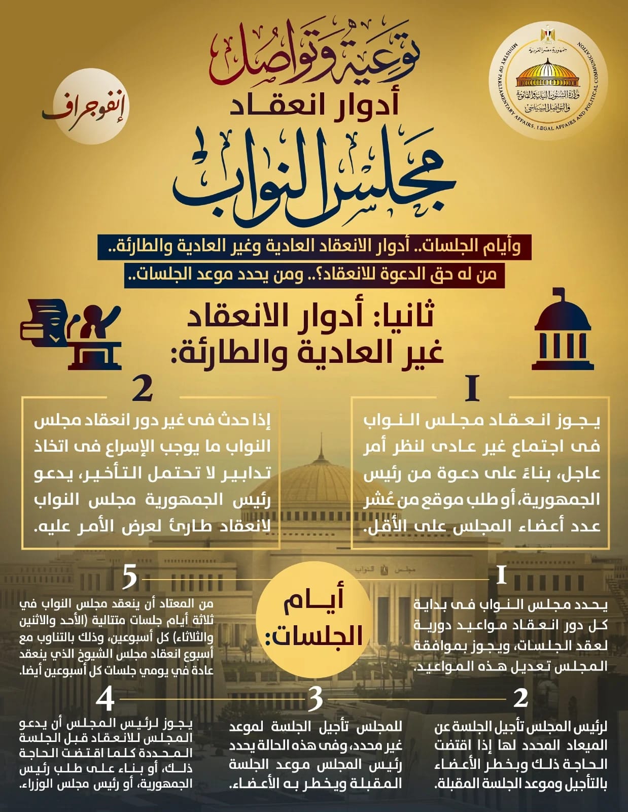 أصدرت وزارة الشؤون النيابية والقانونية والتواصل السياسي بيانًا توعويًا جديدًا بعنوان "توعية وتواصل.. أدوار انعقاد مجلس النواب وأيام الجلسات.. أدوار الانعقاد العادية وغير العادية والطارئة.. من له حق الدعوة للانعقاد؟.. ومن يحدد موعد الجلسات.. إنفوجرافا.