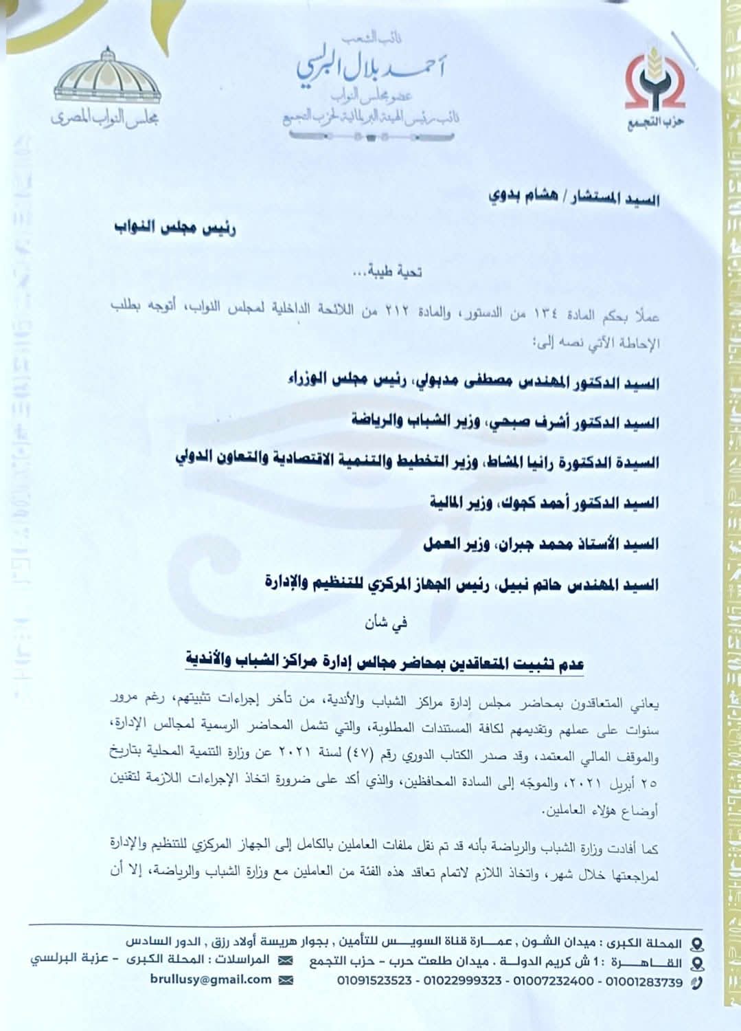 البرلسي يتقدم بطلب إحاطة جديد ضد رئيس الحكومة وعدد من الوزراء لإنهاء معاناة المتعاقدين بمراكز الشباب والأندية