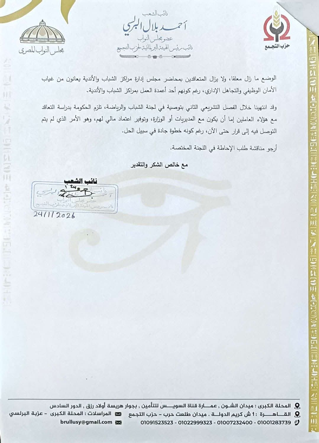 تقدّم النائب البرلسي بطلب إحاطة جديد إلى رئيس مجلس الوزراء وعدد من الوزراء المعنيين، بشأن عدم تثبيت المتعاقدين بمحاضر مجالس إدارة مراكز الشباب والأندية، وما يترتب على ذلك من استمرار معاناتهم وغياب الأمان الوظيفي.