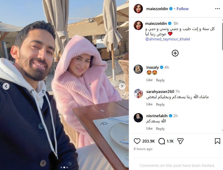 وشاركت مي عز الدين جمهورها مقطع فيديو به صور تجمعهما، من خلال حسابها الرسمي عبر موقع تبادل الصور والفيديوهات القصيرة إنستجرام، وكتبت: «أحبك على كل شئ.. شكرًا لكونك أنت».