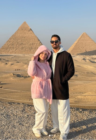 وحرصت مي على توجيه رسالة رومانسية لزوجها، حيث شركت جمهورها صورا تجمعهما من امام الأهرمات، من خلال حسابها الرسمي عبر موقع تبادل الصور والفيديوهات القصيرة إنستجرام، وكتبت: كل سنة و إنت طيب و جنبي ونسي و حبي و عوض ربنا ليا.