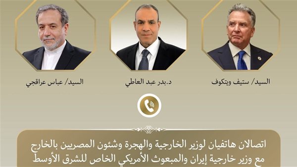 أجرى د. بدر عبد العاطي وزير الخارجية والهجرة وشئون المصريين بالخارج اتصالين هاتفيين بكلٍ من "عباس عراقجي" وزير خارجية إيران، و"ستيف ويتكوف" المبعوث الأمريكي الخاص للشرق الأوسط موخراً، حيث تناولت الاتصالات المستجدات بالمنطقة في ظل تصاعد حدة التوتر بالإقليم.