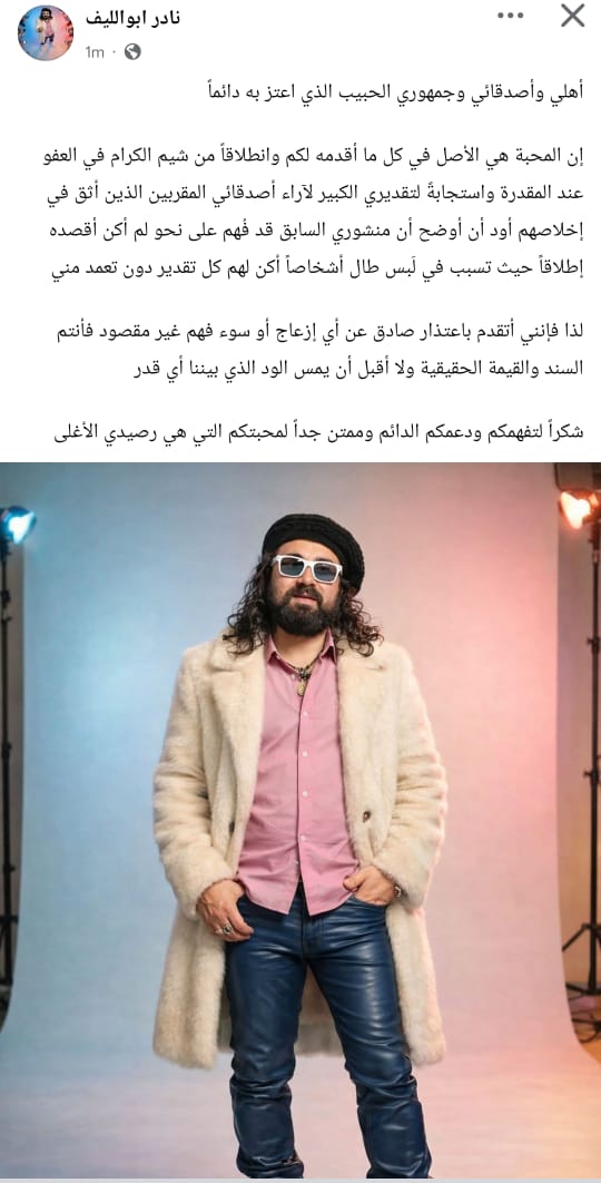 نادر أبو الليف يعتذر لجمهوره بعد منشوره الأخير