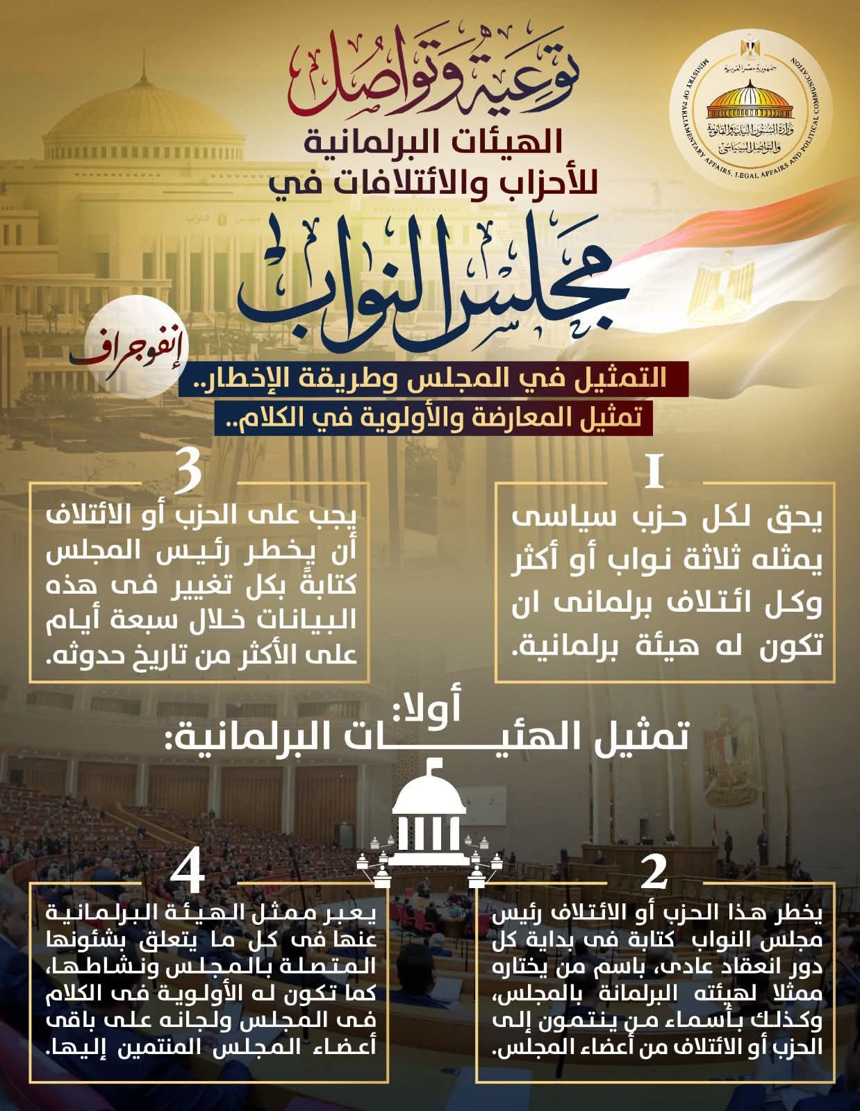 نظّم القانون واللائحة الداخلية لمجلس النواب قواعد تشكيل الهيئات البرلمانية للأحزاب والائتلافات وآليات تمثيلها داخل المجلس، بما يضمن تنظيم العمل النيابي وتحديد الأولويات في التحدث وتمثيل الآراء المختلفة.