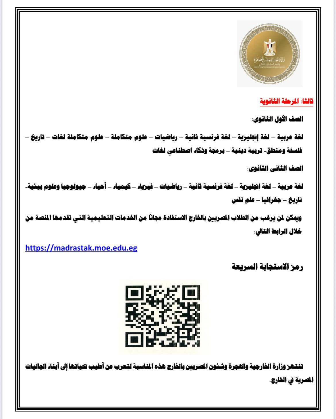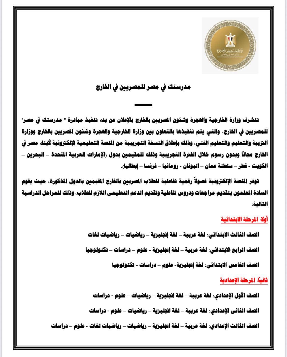 تتشرف وزارة الخارجية والهجرة وشئون المصريين بالخارج بالإعلان عن بدء تنفيذ مبادرة " مدرستك في مصر" للمصريين في الخارج والتي يتم تنفيذها بالتعاون بين وزارة الخارجية والهجرة وشئون المصريين بالخارج ووزارة التربية والتعليم والتعليم الفني، وذلك بإطلاق النسخة التجريبية من المنصة التعليمية الإلكترونية مجانا وبدون رسوم خلال الفترة التجريبية